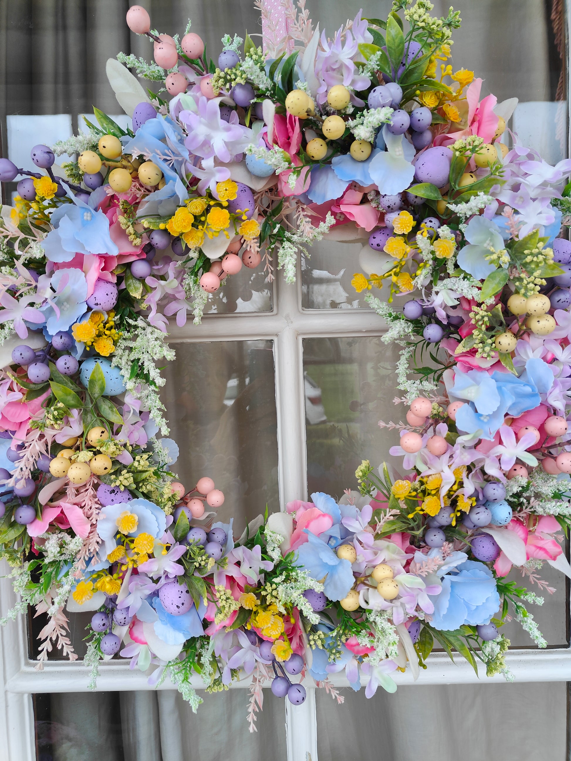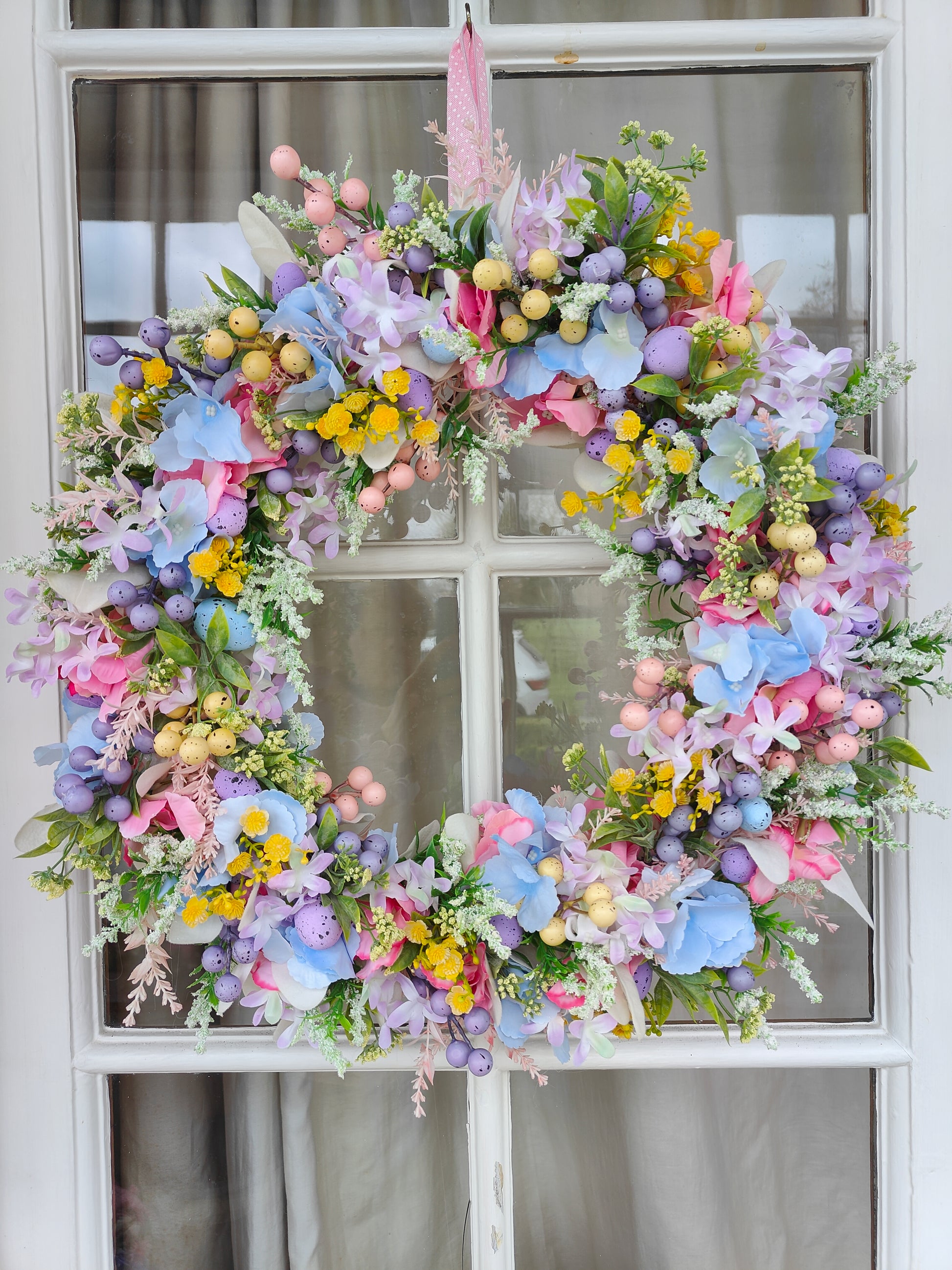 Bring the joy of spring to your home with this beautifully arranged pastel Easter wreath, filled with charming Spring florals and mini eggs galore.